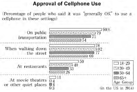 The above graph shows the percentage of Americans in different age groups who said it was “generally OK” to use a cellphone in different settings in 2014. ① In the setting of “On public transportation,” the younger groups are more accepting than the older ones regarding cellphone use. ② “When walking down the street” is the setting in which people aged 30-49 are more permissive towards cellphone use than the other age groups. ③ As for “At restaurants,” 50% of the 18-29 year olds answer that it is acceptable to use cellphones while 26% of those 65 and older say the same. ④ Only 4% of people in each of the two age groups, 30-49 and 50-64, agree that cellphone use is acceptable in the setting of “At movie theaters or other quiet places.” ⑤ In the same setting, less than 10% of people in each age group answer that it is acceptable to use cellphones.
