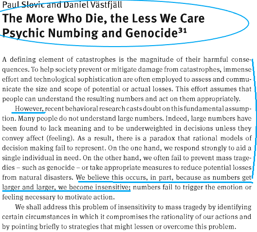 We believe this occurs, in part, because as numbers get larger and larger, we become insensitive; numbers fail to trigger the emotion or feeling necessary to motivate action.