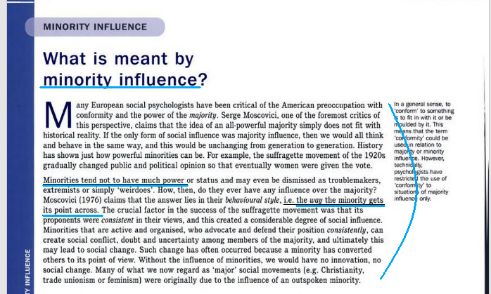 Minorities tend not to have much power or status and may even be dismissed as troublemakers, extremists or simply ‘weirdos’. How, then, do they ever have any influence over the majority? The social psychologist Serge Moscovici claims that the answer lies in their behavioural style, i.e. the way _________________________________. The crucial factor in the success of the suffragette movement was that its supporters were consistent in their views, and this created a considerable degree of social influence. Minorities that are active and organised, who support and defend their position consistently, can create social conflict, doubt and uncertainty among members of the majority, and ultimately this may lead to social change. Such change has often occurred because a minority has converted others to its point of view. Without the influence of minorities, we would have no innovation, no social change. Many of what we now regard as ‘major’ social movements (e.g. Christianity, trade unionism or feminism) were originally due to the influence of an outspoken minority.