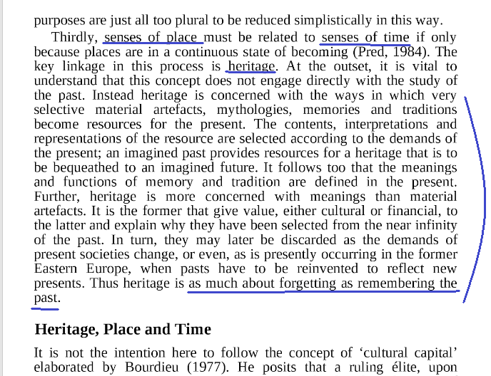 Heritage is concerned with the ways in which very selective material artefacts, mythologies, memories and traditions become resources for the present.