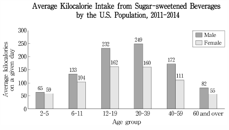 The graph above shows the average kilocalorie intake from sugar-sweetened beverages by age group and gender on a given day during 2011-2014 in the United States. ① In each age group, males had higher average kilocalorie intake from sugar-sweetened beverages than females did. ② Among the male groups, the group aged 20-39 had the highest average kilocalorie intake from sugar-sweetened beverages. ③ Among the female groups, the group aged 12-19 had the highest average kilocalorie intake from sugar-sweetened beverages, followed by the group aged 20-39. ④ Among the male groups, the group aged 2-5 had the lowest average kilocalorie intake from sugar-sweetened beverages. ⑤ Among the female groups, likewise, the youngest group had the lowest average kilocalorie intake from sugar-sweetened beverages.