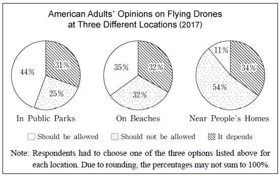 The three pie charts above show the percentages of American adults’ responses to a survey conducted in 2017. The survey asked whether people should be allowed to fly drones at three locations: public parks, beaches, and near people’s homes. ① While 44% of the respondents said people should be allowed to fly drones in public parks, 25% said people should not be allowed to do so. ② When asked if people should be allowed to fly drones on beaches, 35% of the respondents said it should be allowed and 32% said it should not. ③ More than half of the respondents said people should not be allowed to fly drones near people’s homes. ④ Less than 10% of the respondents said people should be allowed to fly drones near people’s homes. ⑤ For each of the three locations, the proportion of the respondents who chose “It depends” is above 30%.